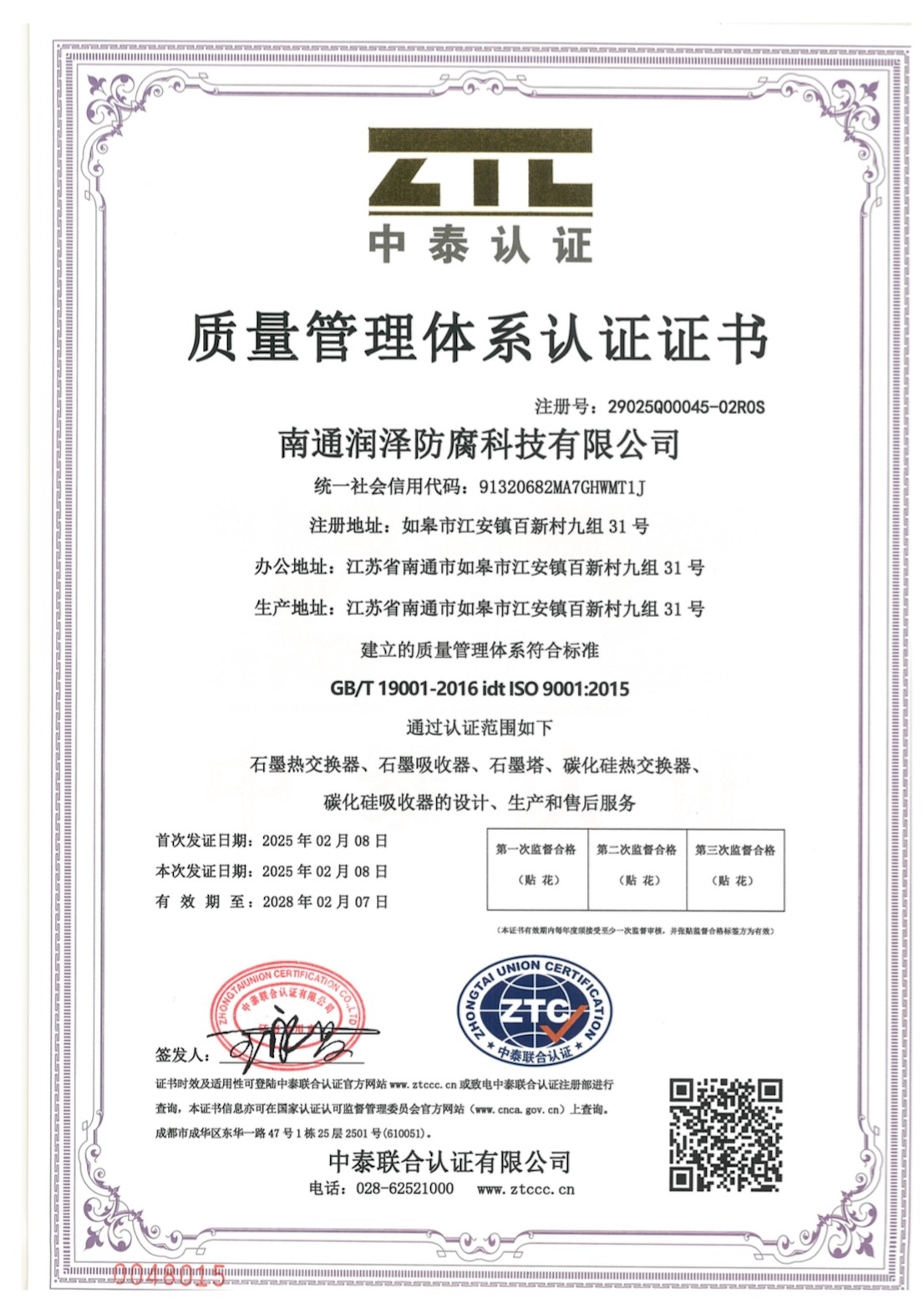 南通潤(rùn)澤防腐科技有限公司深耕防腐領(lǐng)域十余年,主營(yíng)防石墨及碳化硅設(shè)備,提供鹽酸解析,鹽酸吸收,硫酸提濃與稀釋等成套裝備和技術(shù),產(chǎn)品廣泛應(yīng)用于化工,醫(yī)藥,農(nóng)藥,電子化學(xué),鋰電等領(lǐng)域。公司擁有多項(xiàng)國(guó)家專利,先后榮獲“南通市AAA信用企業(yè)”“中國(guó)防腐行業(yè)十佳品牌”等榮譽(yù),致力于成為全球領(lǐng)先的防腐化工設(shè)備制造商。
